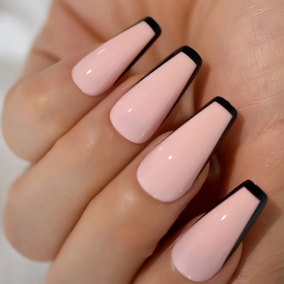 24 Pcs Black Tip French Long Press On Nails – Gothic Pink Set