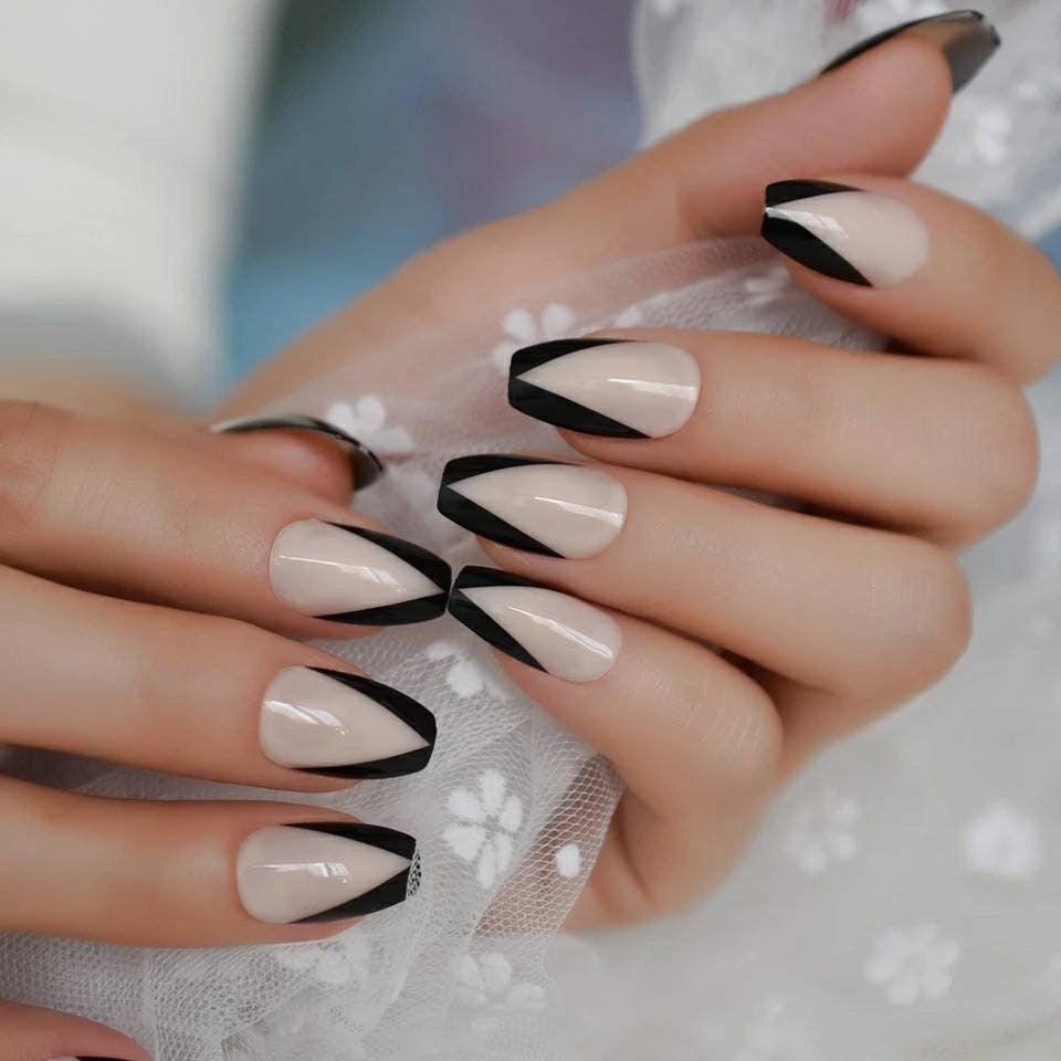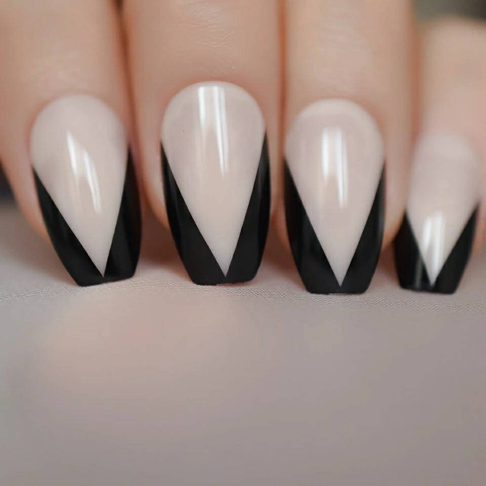 24PCS V-Shape Black Tip French Long Press On Nails – Gothic Medium Glue-On Set
