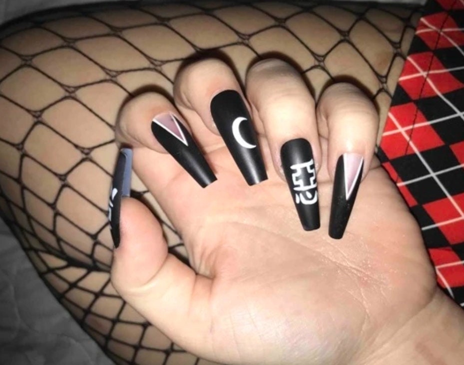 Goth Matte Black Press-On Nails – 24 Long Coffin Nails with Crescent Moon Design.