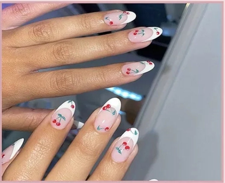 24 PCS Nude Cherry Heart Long Press On Nails – Almond Shape, Kawaii Pink French Tips