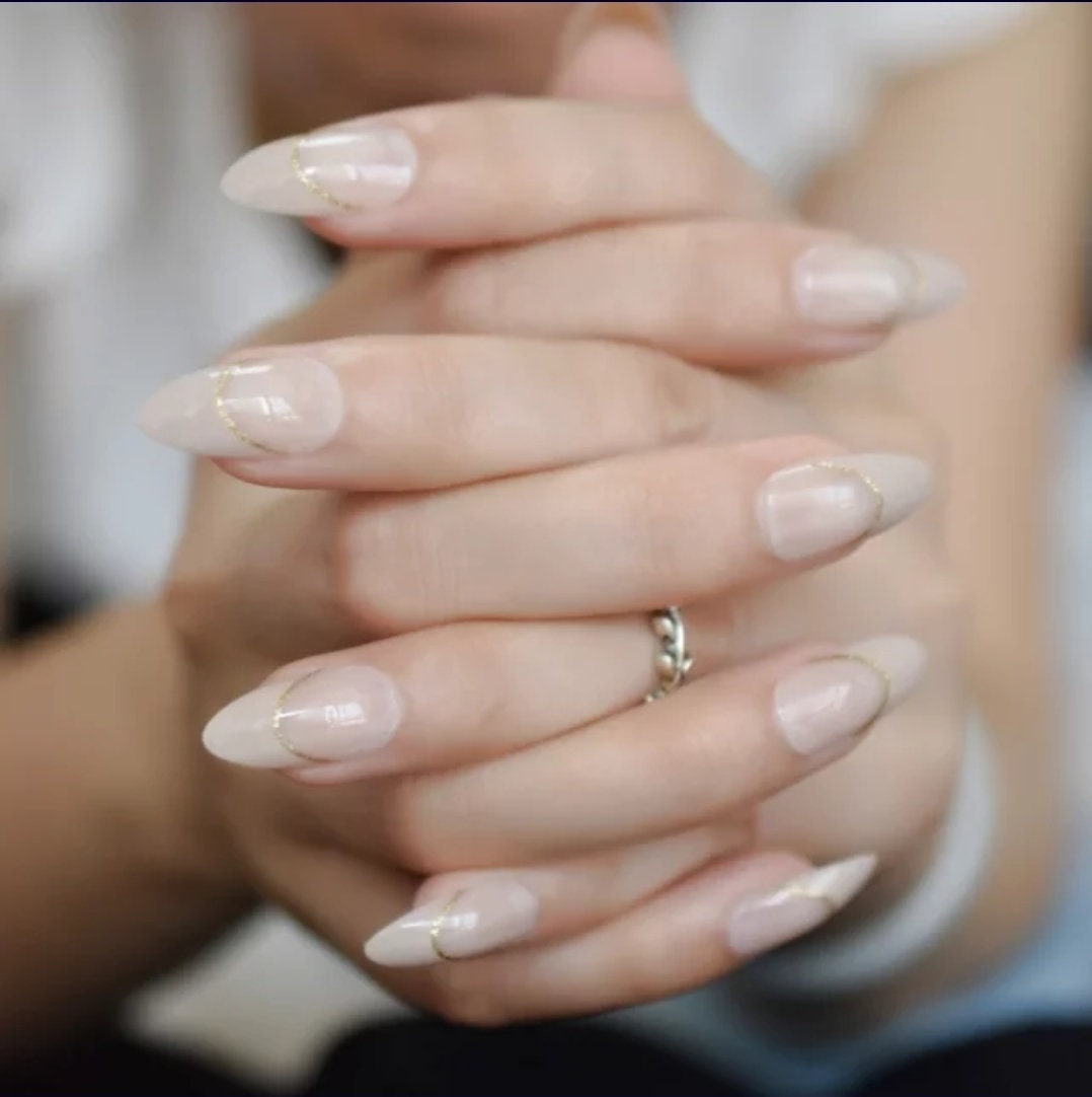24pcs Nude Long Press On Nails – Gold Ring Line Medium Stiletto Almond