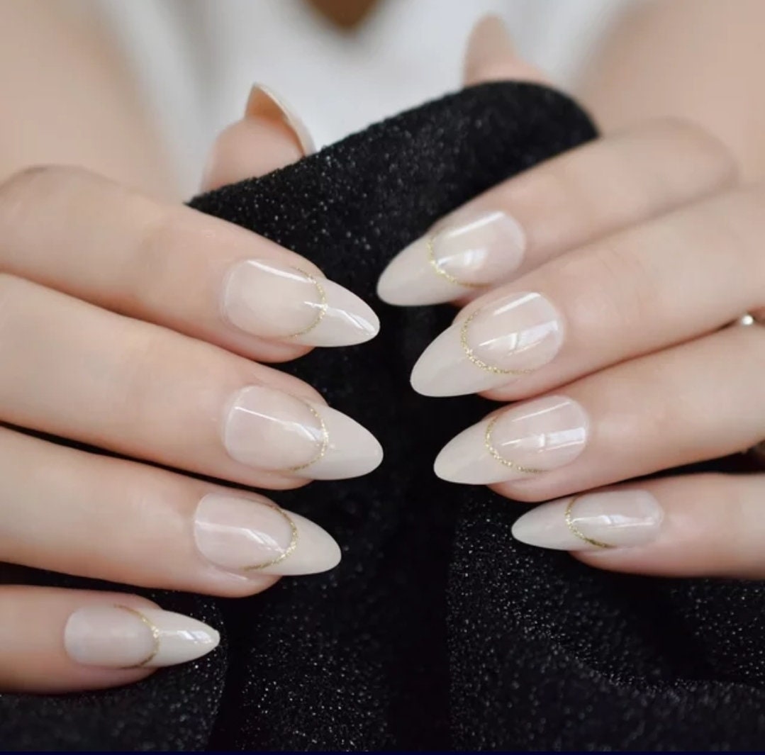 24 PCS White Long Press On Nails – Nude Gold Tip Medium Stiletto Almond Pointed Nails.