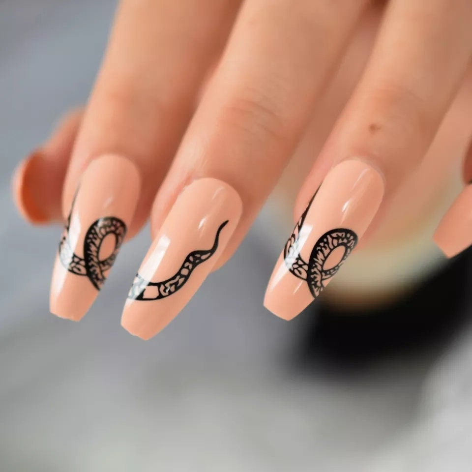 24 Nude Snake Long Press on nails glue on natural Coffin tan black goth hot