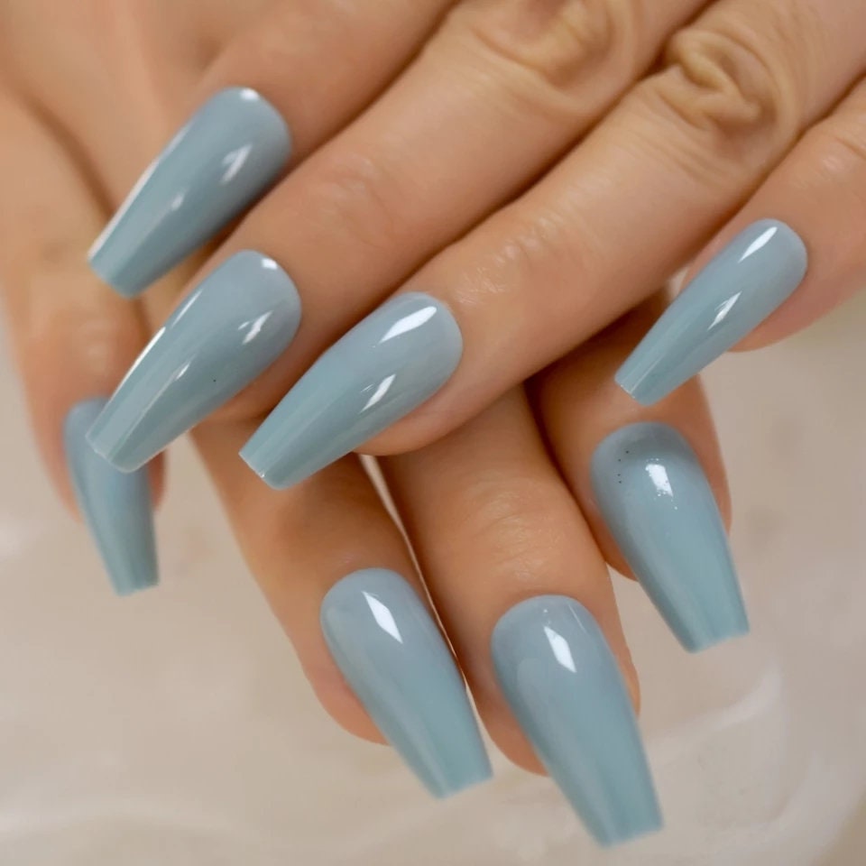 24 PCS Glossy Pale Blue Coffin Long Press-On Nails – Soft Pastel Shine