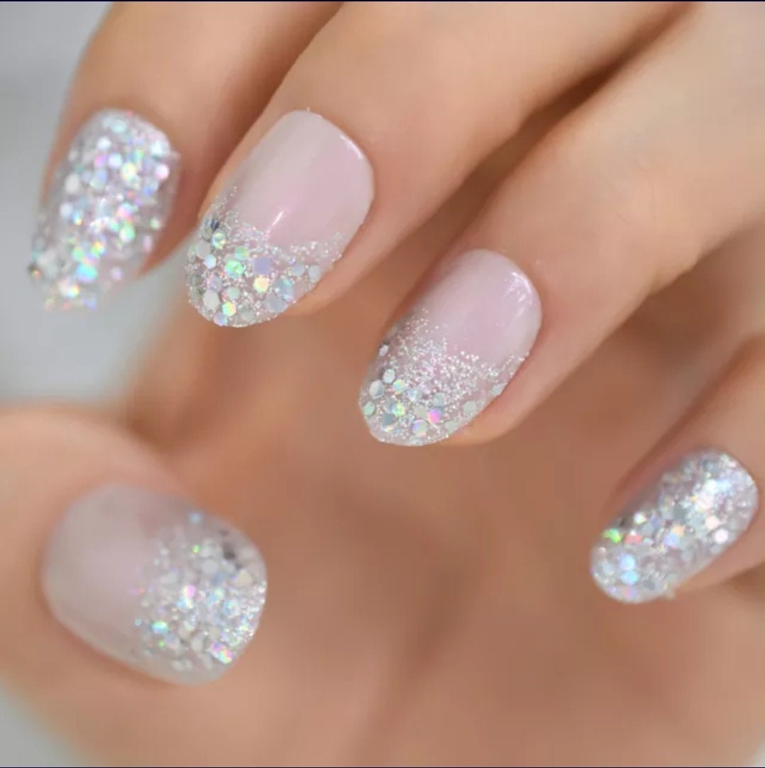 24 pink nude Short Press on nails Holographic glitter oval almond iridescent Unicorn glue on pink shimmer.