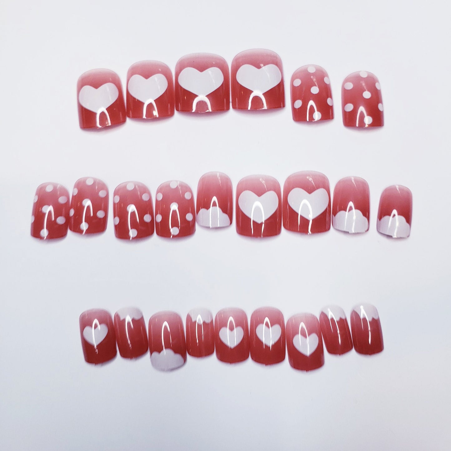 24PCS Short Press On Nails – Kawaii Red Hearts & Polka Dots with Rosy Clouds Jelly Finish