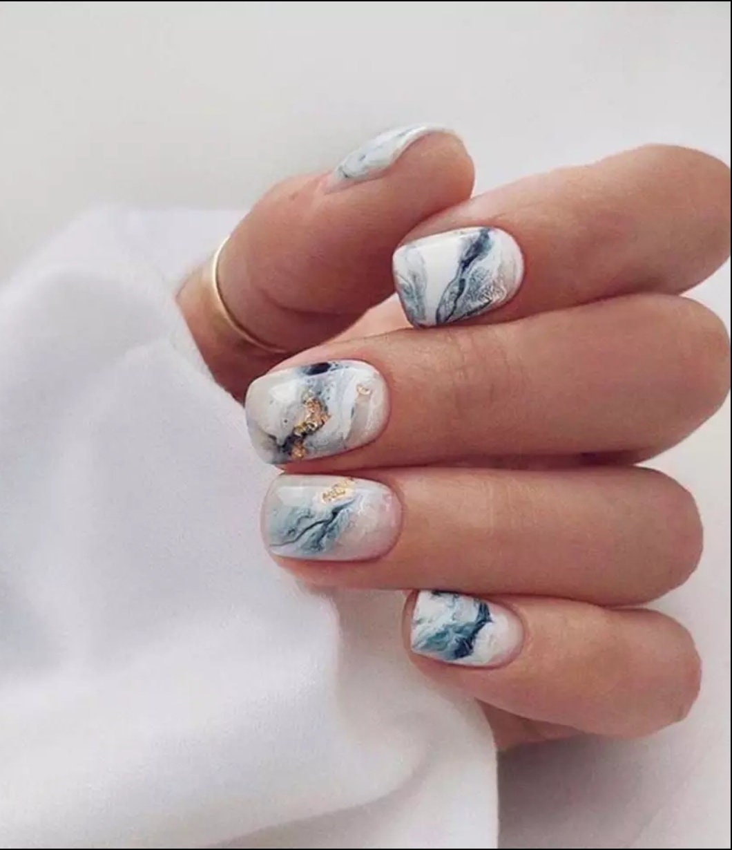 24 white blue marble pour Short Press On Nails kit glue on Gray Blue art stone quartz liquid pour dirty.