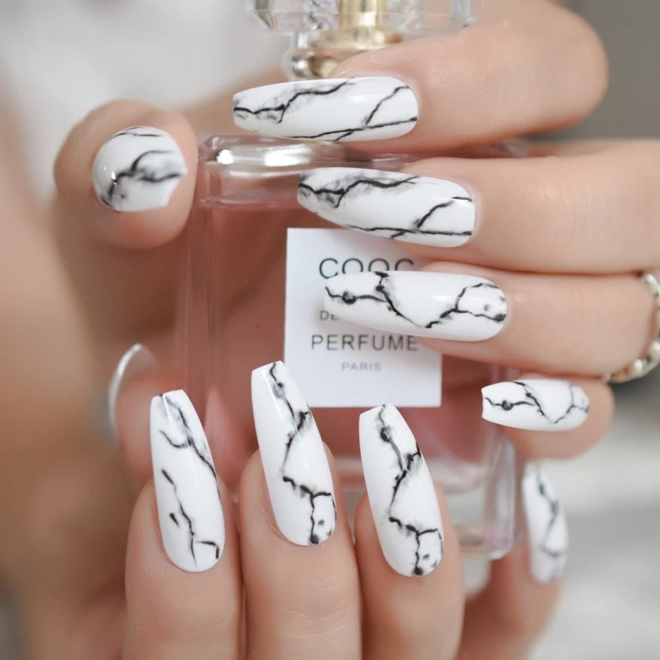 24 PCS White Marble Long Press On Nails kit glue on coffin black art