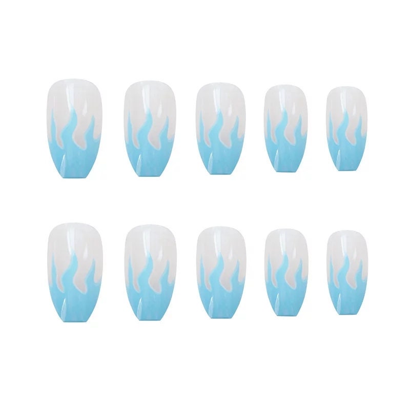 24 pcs Blue Flame Long Press on nails glue on Coffin ombre clear nude medium trendy