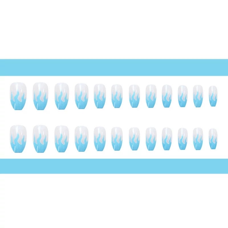 24 pcs Blue Flame Long Press on nails glue on Coffin ombre clear nude medium trendy.