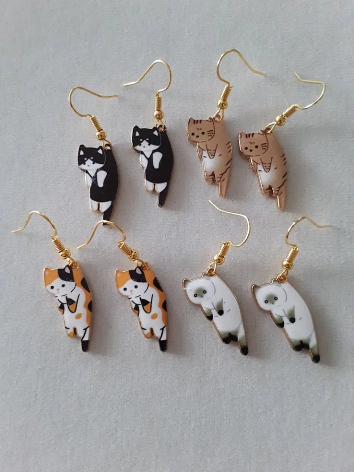 Beautiful Hanging Cat Earrings with Dangle hooks in various colors, including tan, black, white, orange, tabby, calico, tan brown, and siamese. Cartoon hanging design available. Ships within 24 hours - for 2 cats, please contact or leave a note.