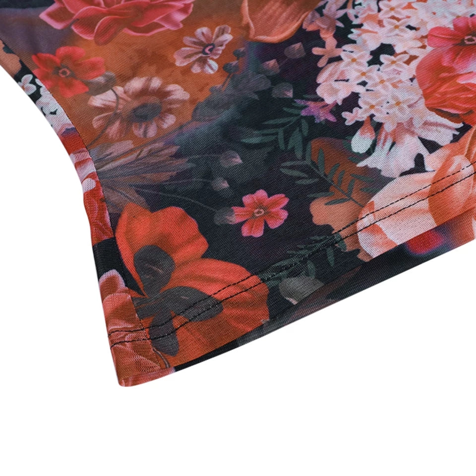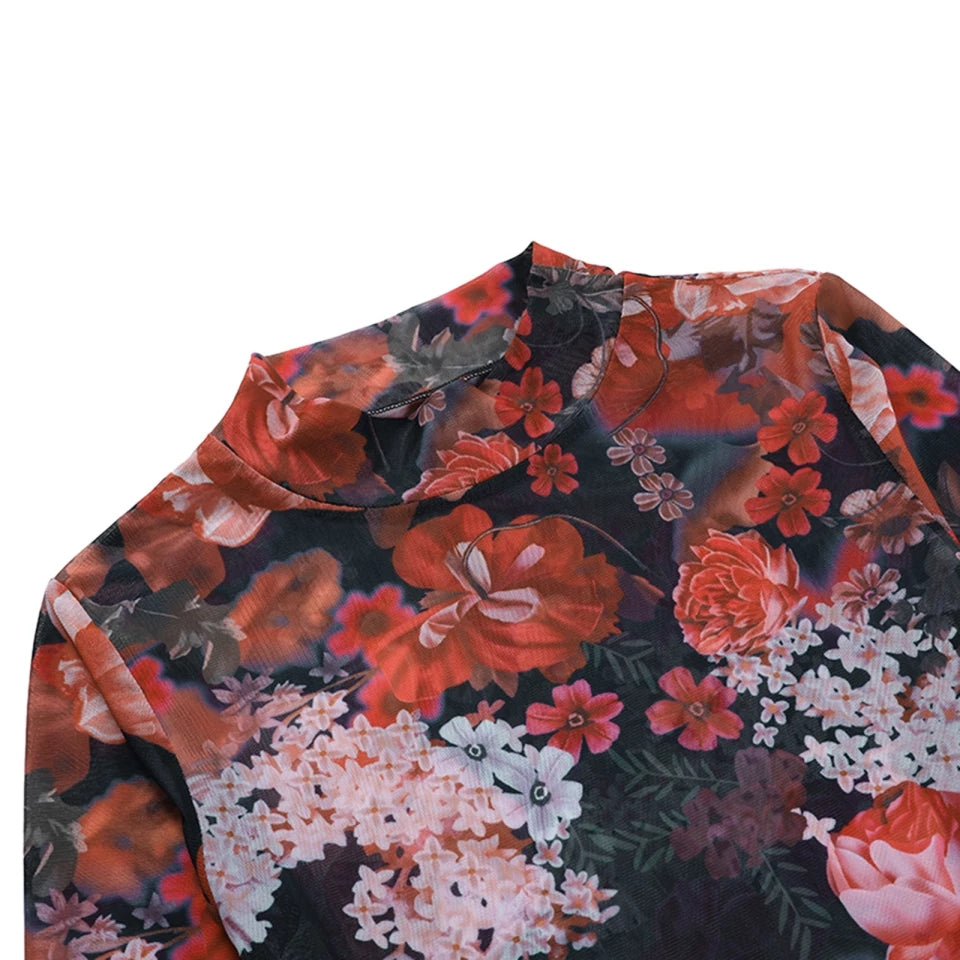 Elegant Rose Sheer Mesh Going out tops for women long sleeve full waist shirt floral colorful see through black red