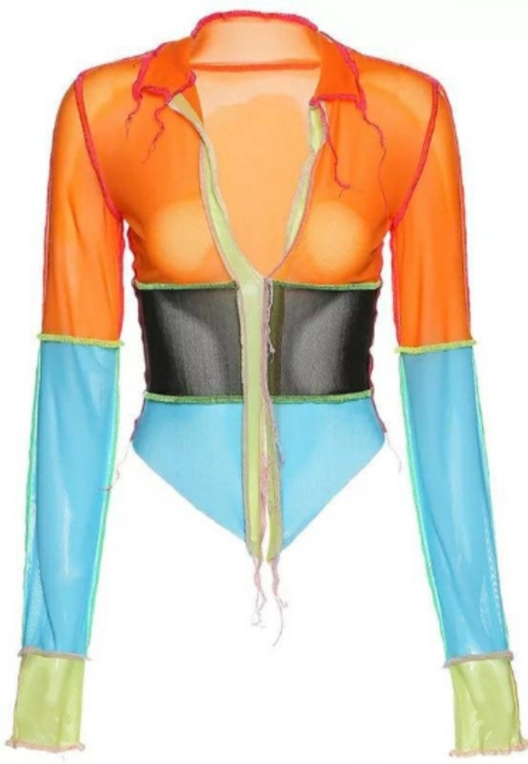 Multicolor Sheer Mesh Going out tops long sleeve shirt funky 90s trendy colorful see through orange black blue fray.