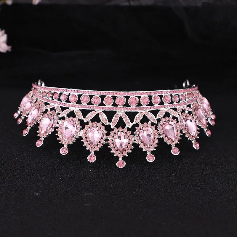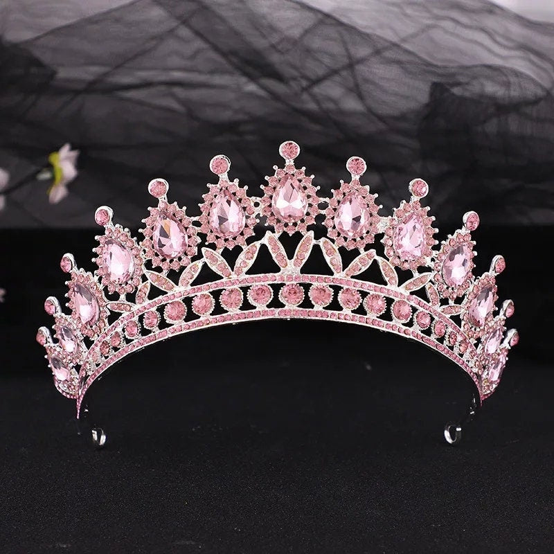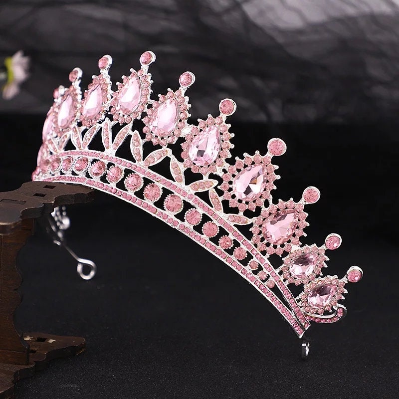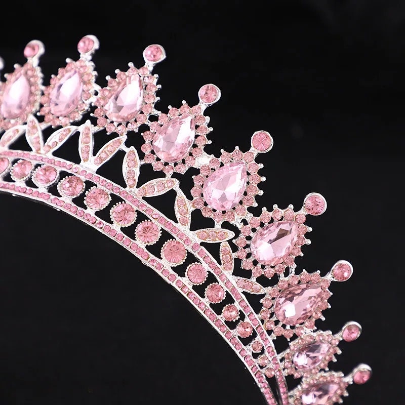 Pink Crystal Silver Tiara Crown – Rose Gold Princess Queen Headdress for Bridal Hair Jewelry