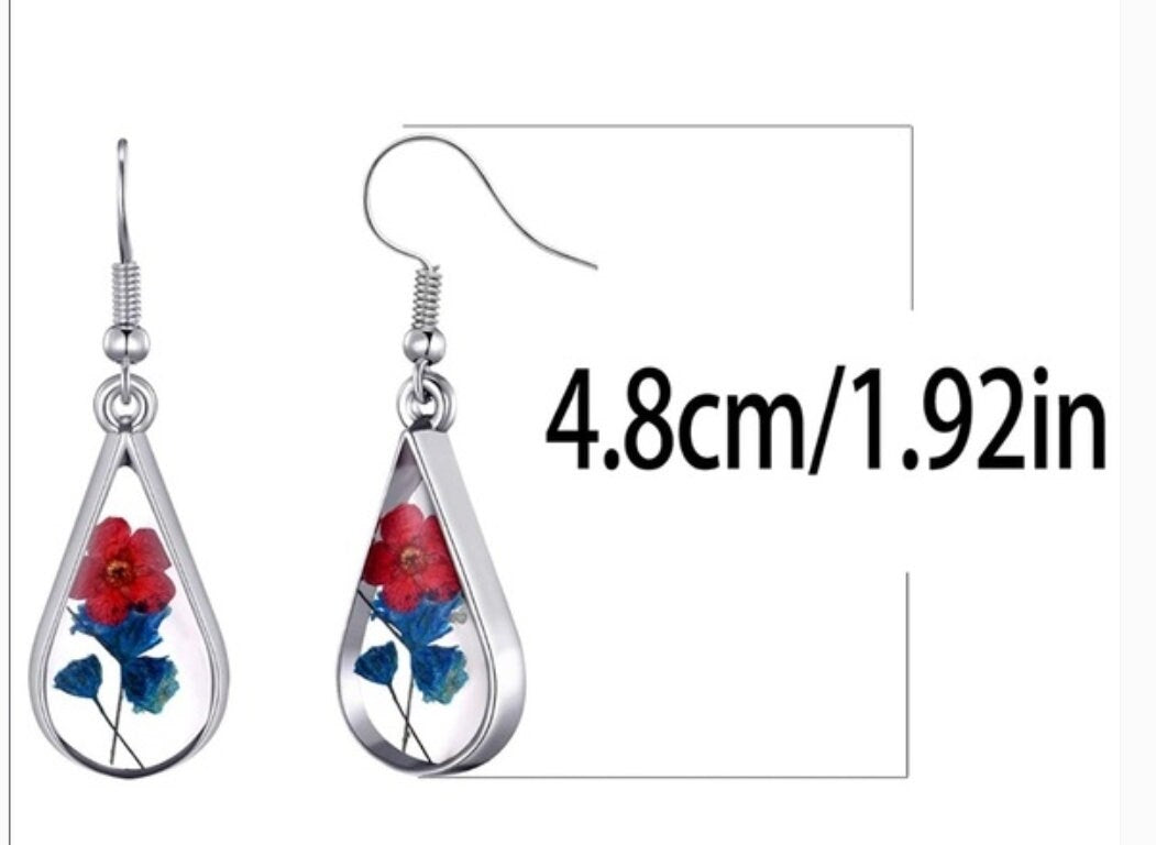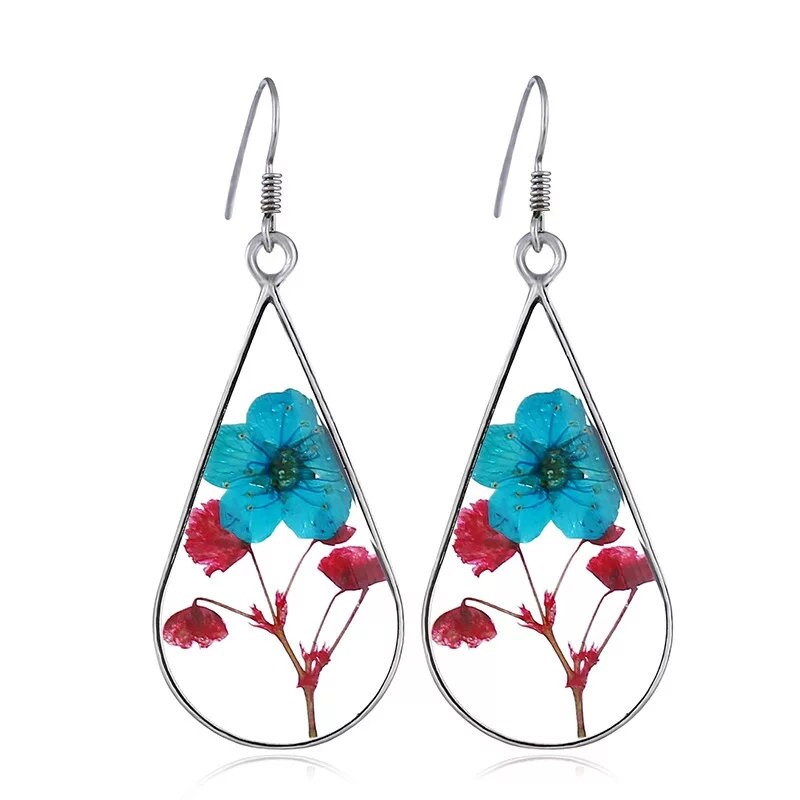 Real dried pressed Flower Earrings Dangle Tear Drop Blue red clear glass resin cottage core Jewelry