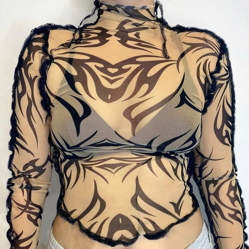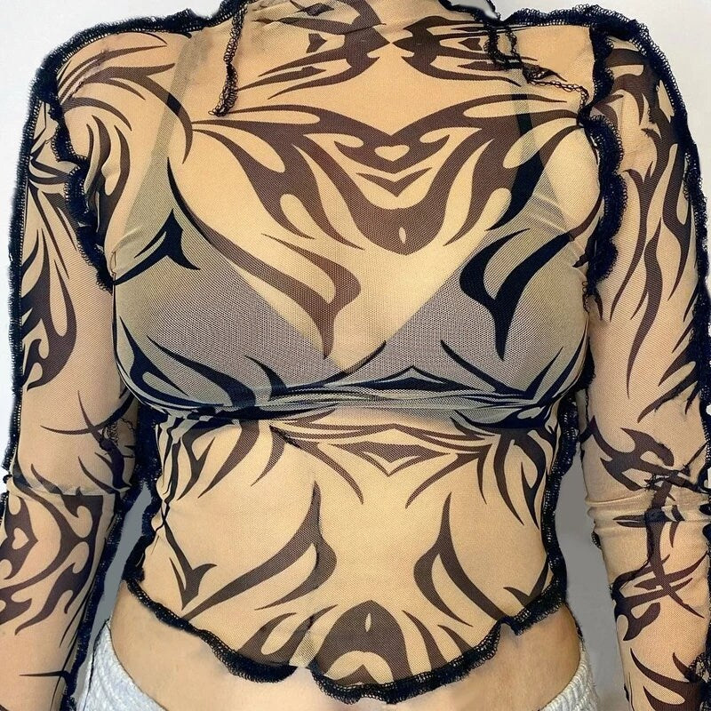 Sheer Nude Black Tribal 90s Y2K Mesh Summer Tops Long Sleeve full waist Soft Stretchy tattoo Elegant Mock Neck see through classic stripe skin tone