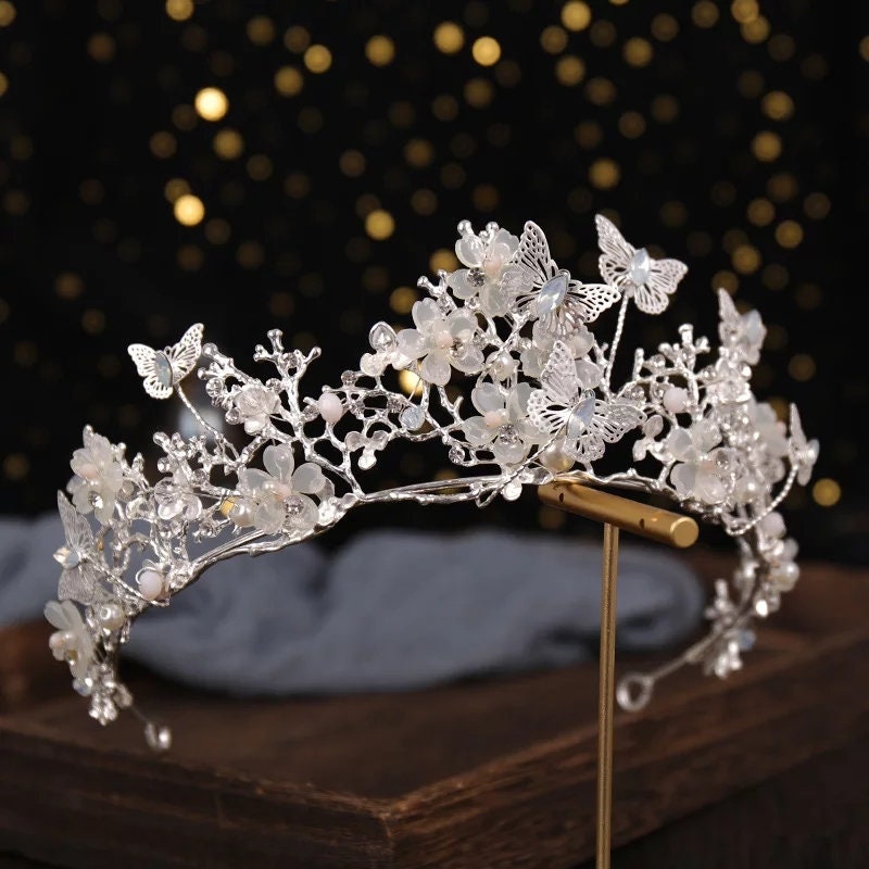 Silver Butterfly Princess Tiara Detailed Queen headdress jewelry bridal Halloween cosplay diadem Wedding pageant royalty Silver pastel.