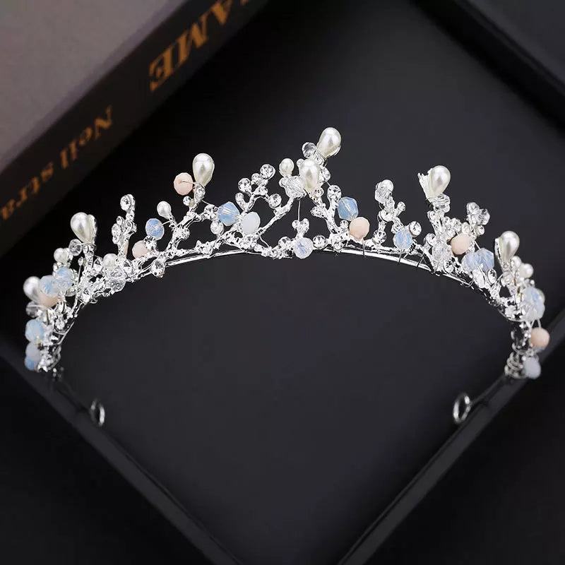Silver Pearl princess tiara Queen smaller demure headdress jewelry bridal Halloween cosplay diadem pink opal Wedding pageant royalty.